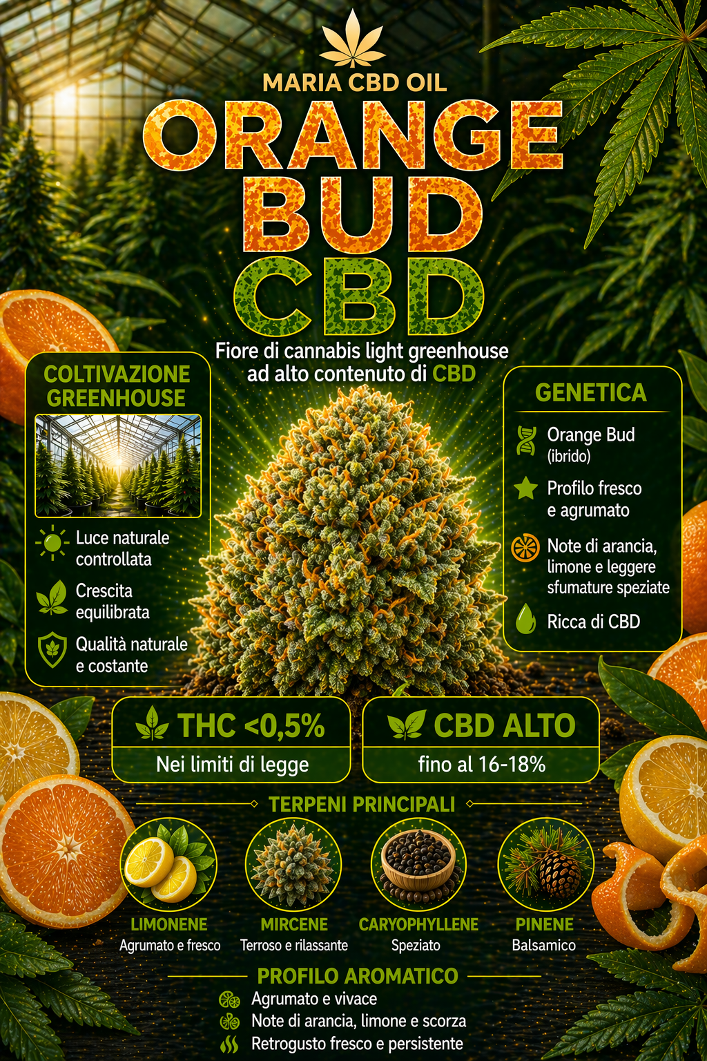 Obecnie Orange BUD jest uważany za królową konopi old school sativa. Jednym z jej atutów jest niewątpliwie charakterystyczny intensywny smak, z posmakiem typowym dla rodziny cannabis indica. Ta intensywność aromatu i zapachu sprawia, że pomarańczowy BUD jest bardzo podobny do tych genetyk, które są bogate w THC. Orange BUD zawdzięcza swoją nazwę obecności pomarańczowo zabarwionych słupków w swoich kwiatostanach, kwiatostany zwarte i duże, o jasnozielonym kolorze.